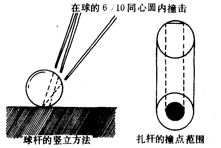 | 释义 | 扎杆杆法 扎杆杆法台球击球的一种方法。当本球和两个目标球靠得非常近,并且并列在一条直线上,用普通杆法球互相妨碍,不容易打好,这时就要用一种特殊的击球方法,使球杆立起来撞击球,扎杆是一项高级技术。扎杆姿势是要靠近球台,两脚稍微分开,上体略向前倾,脸部比球杆稍向前些,面颊内收,将球杆立起约70°。扎杆时从球的上方给球以逆转的力,使本球沿着弧线运动的同时,还向前移动。扎杆的撞点范围应在球的6/10同心圆内撞击。(图2—3—47)