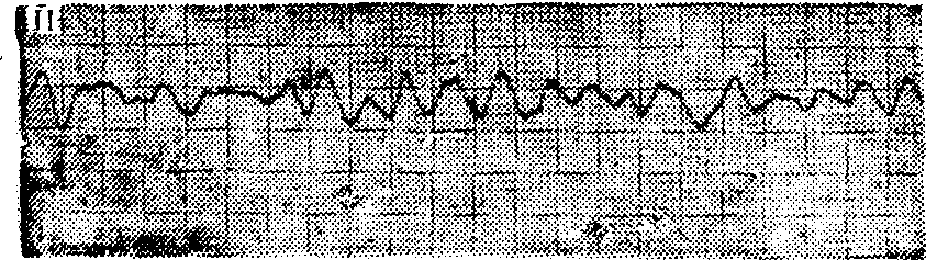 图2 心房颤动心电图 心室扑动: 辨认不出QRS波群及ST-T,以快速、规则、连续的高大波代之,频率每分钟200~250次。 心室颤动: QRS波群完全消失,以形状不同、大小各异、极不匀齐的连续低小波代之。频率每分钟为200~500次。随着病情的进展,颤动波愈来愈细小而缓慢,最后导致心室停搏。