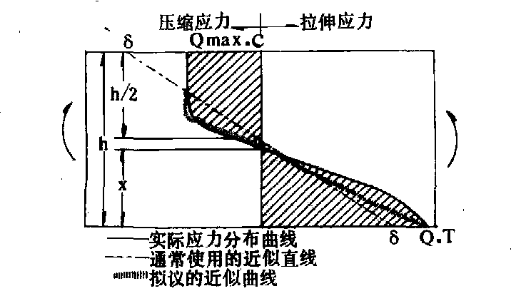 图2 木梁弯曲破坏时实际及近似的应力分布 抗弯强度bending strength又称静曲强度。木材构件支承横向荷载的能力。通常在静力荷载下测定。木构件中的梁、搁栅、地板等主要依靠抗弯强度。 抗弯强度bending strength |
