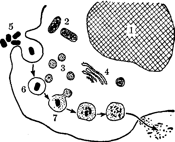 吞噬细胞对细菌的吞噬和消化过程示意图 1. 细胞核 2. 线粒体 3. 溶酶体 4. 内质网5. 细菌 6. 吞噬体 7. 吞噬溶酶体 病原菌被吞噬细胞吞噬后,其后果随各人免疫程度和病菌的种类、毒力等不同而异。大多化脓性细菌被吞噬后,在5~10分钟内死亡,30~60分钟内消化破坏,此为完全吞噬。结核杆菌、麻风杆菌、布鲁杆菌、伤寒杆菌等胞内寄生菌,在免疫力低的人体内,虽被吞噬却不能杀灭,是为不完全吞噬。不完全吞噬反使这些病菌得到保护,不受免疫血清等体液中杀菌以及抗生素等药物的影响; 有的甚至可在吞噬细胞内生长繁殖,引起细胞死亡; 或随游走吞噬细胞经血液或淋巴液被带至人体其他部位,造成扩散,引起更广泛的感染。此外,吞噬细胞在吞噬过程中,溶酶体释放出的多种酶,在一定条件下,也能破坏邻近组织细胞,造成组织损伤。 正常体液和组织中的抗菌物质 血液、淋巴液等正常体液和组织中含有多种抗病原菌物质(表)。这些物质直接杀灭病原体的作用不如吞噬细胞强大,而往往是配合其他杀菌因素发挥作用的。 补体是存在于正常人和动物血清中的一组蛋白酶,具有很重要的生物学活性,并能协同和加强抗体的作用。如杀菌、溶菌等均需补体参加,此外尚有趋化、促进吞噬等作用,是扩大特异性免疫反应的重要因素。 溶菌酶是一种分子量为14,700的小分子不耐热碱性蛋白质,广泛存于唾液、泪液、乳汁、肠分泌物和吞噬细胞溶酶体颗粒中。溶菌酶能水解革兰阳性菌细胞壁中乙酰葡糖胺与乙酰胞壁酸分子间的连结,使细胞壁破坏,水分进入,最后细菌崩解。革兰阴性菌细胞壁的粘肽层外尚有脂多糖和脂蛋白层,故不受其影响。但在抗体协同下,脂多糖和脂蛋白层受到破坏,溶菌酶才发挥作用。当抗体、补体、溶菌酶三者共存时,溶菌作用更为显著。 乙型溶素是存在于人血清中的一种含赖氨酸的多肽,其作用不需补体和镁离子协同,即能溶解革兰阳性细菌。乙型溶素与溶菌酶不同点是前者不存在于中性粒细胞中,且其破坏革兰阳性菌细胞壁的程度不如溶菌酶彻底。 正常体液和组织中的抗菌物质