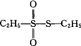 | 释义 | 抗菌剂402有机硫杀菌剂。化学名称:乙基硫代磺酸乙醋。化学结构式如下。原药为微黄色透明液体,挥发性强,具大蒜味,水中溶解度为1.2%,可溶于多种有机溶剂。广谱性杀菌剂,主要作种苗处理(浸种、闷种)防治水稻、棉花、大豆、山芋等种传病害,亦可土壤浇灌处理和叶面喷洒。与其他药剂混配作蚕药用。使用浓度下对植物安全,种苗处理的水稻、棉籽出苗快、壮等特点。对大鼠急性口服LD50为140 mg/kg,对皮肤有灼伤作用。