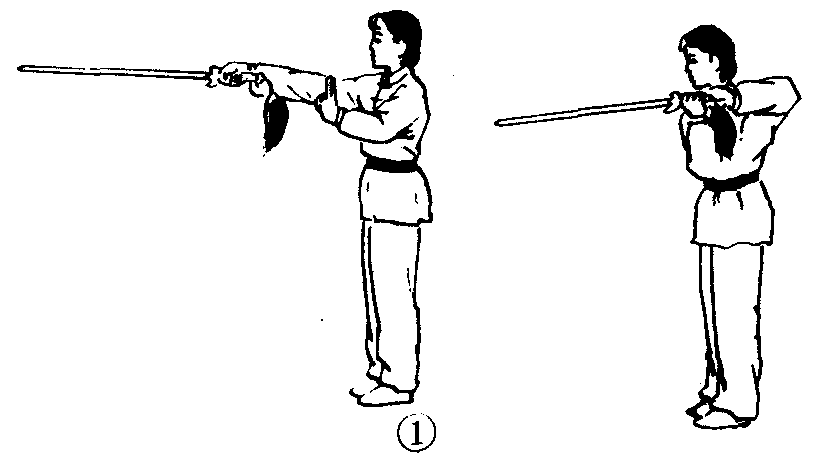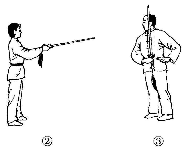 剑法之一。是右手持剑于胸,左手剑指放于剑柄一侧的动作。在传统剑法中,左手成掌附于剑柄,并不实抱。现代剑术套路中抱剑出现的次数较少。动作过程:抱剑有剑尖向右成立剑的横抱剑(图2—4—113—❶)、剑尖向前成平剑的平抱剑(图2—4—113—❷)、剑尖向上的立抱剑(图2—4—113—❸)等形式。动作要领:剑与胸同高,左手成剑指平抱剑,掌心向上;立抱剑和横抱剑手心向里。攻防含义:抱剑是防中待攻的剑法。是双手用剑的准备动作。