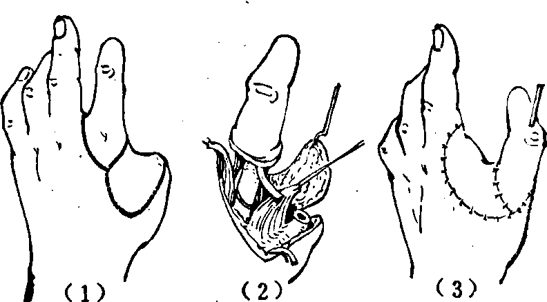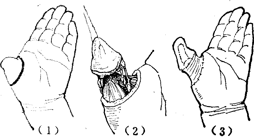 图1 第一掌骨拇化术 (2)拇指残端脱套加长术: 可用于拇指近侧指节部分缺损或全缺损,其残端皮肤较松软并与截骨骨面间没有显著粘连的病例。因所能增加的长度限于2cm左右,故当其余手指也有伤损时较为适用。本法优点为手术操作较为简单,指端的血液循环和感觉都较好,缺点是所能延长的长度不多。手术时在拇指根部距残端约3cm部位作环形切口,将残端皮肤在皮下组织深层剥离使与骨残端完全分离呈脱套状,充分仔细游离两侧指神经血管束以松动之,乃形成以神经血管束为蒂的帽形岛状皮瓣。取髂骨一块,于适当切削后插入指骨或掌骨残端的骨髓腔中。将帽形皮瓣利用神经血管束的弹性前徙,包住移植的骨块。注意检查顶端皮肤是否因血管受过度牵拉而显现苍白的动脉供血不足现象,以适当调整植入骨块的长度。前徙后所遗创面植以中厚或全层皮片(图2)。另法,可在残指根部桡侧作半环状的切口,其他操作如上,形成一风帽形带蒂皮瓣前徙后,植骨延长(图3)。