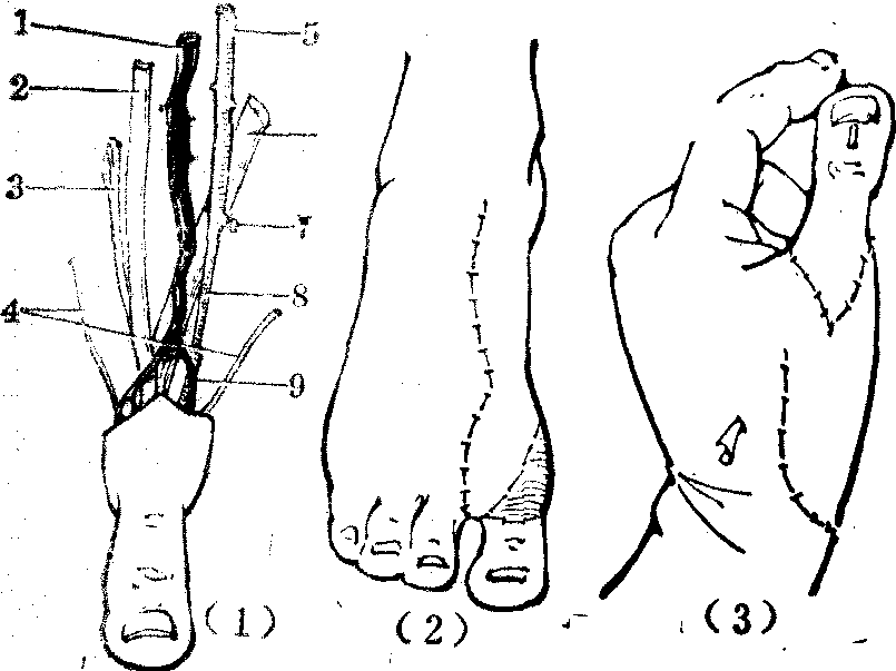 图5 示指转位拇化术 (7)趾移植术:移植第二趾或𧿹趾再造拇趾,适用于拇指完全缺失或还包括掌骨的缺失。趾移植有两种方法: ❶将趾与拇指残端间先部分接合的有蒂移植法,手和脚间用石膏绷带固定在一起,俟逐渐建立血运后断蒂,手足分开。此种方法痛苦大效果差。 ❷吻合血管的游离趾移植法,外形和功能均较满意,但技术操作复杂要求高。 吻合血管的趾游离移植,供趾取自同侧或对侧的第二趾,经检查确认足背动脉搏动良好即可选用。如尚需用跖骨修复掌骨缺损,移植指可连带足背皮瓣一起切取,或预先制备皮管,以供覆盖修复的掌骨和拇指指蹼之需。手术开始时分两组进行。手组,经指残端大鱼际和手背切口,显露拇长伸肌腱、头静脉、桡动脉、第一掌骨残端、拇指指神经和拇长屈肌腱等,并将两个切口在皮下剥通。脚组,经足背和围绕第二趾基部的切口,解剖和游离与第二趾相关的跖背静脉、足背静脉弓和大隐静脉。寻出第一跖背动脉,切断结扎其分支至𧿹趾的两条趾背动脉,保留分支至第二趾的趾背动脉。显示𧿹腓侧和第三趾胫侧的趾底动静脉和趾底固有神经并切断之。切断趾浅屈肌腱,向近端游离趾屈深肌腱,游离第一、二趾底总神经以及互相伴行的第一、二跖底动静脉。在踝关节部位切断趾长伸肌腱,跖骨基部切断趾短伸肌腱后,即可将第二趾自跖趾关节或连带一段跖骨离断或截断。将第一、二趾底总神经游离至足够长度后切断,并将第一、二跖底动静脉切断结扎。至此第二趾仅以足背动脉和静脉与足相连,切断后即可完全离体。脚部创面可用局部皮瓣和皮片移植修复。将游离的第二趾移植至拇指部位。如第一掌骨头完整时,可将跖指关节囊和掌指关节囊吻接。掌骨头不完整时,则将近节趾骨和残留骨端间以克氏针固定于适当位置。先吻合血管,足背静脉与头静脉或手背静脉,足背动脉与桡动脉相吻合。然后吻合肌腱,趾长伸肌与拇长伸肌,趾深屈肌与拇长屈肌腱相接。如拇长伸肌、拇长屈肌腱已不复存在,可以示指的固有伸肌、指浅屈肌代替。再吻合神经,将两条趾神经分别与指神经或指总神经接合。最后缝合或修复皮肤创面(图6)。吻合血管的趾游离移植法,也可用于拇指以外手指的再造,或同时移植两个足趾以分别再造拇指和一个手指。另有吻合血管的𧿹趾皮肤趾甲瓣游离移植再造拇指法,适用于: ❶拇指脱套伤; ❷残留有0.3~1cm近侧指骨的拇指外伤(指骨以骨移植延长); ❸皮管植骨法再造拇指后形态和功能的改善。此法因仅取其皮肤和趾甲,故不致因趾移植造成趾数的减少。