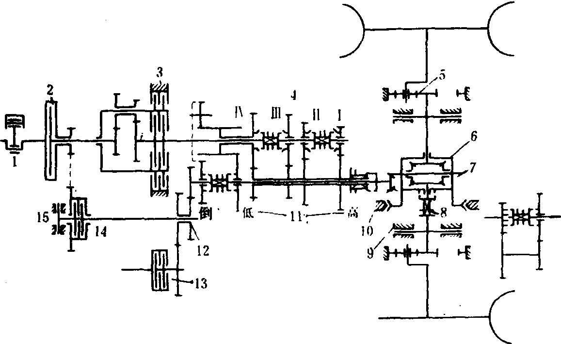 图1 轮式拖拉机传动系统 1.发动机;2.主离合器;3.动力换档快/慢;4.主变速;5.最终传动;6.中央传动与差速器;7.动力输出轴;8.差速锁;9.行车制动器;10.停车制动器;11.组成式变速箱; 12.分动箱;13.前桥驱动离合器;14.动力输出轴离合器;15.动力输出轴制动器 离合器 用于传递和切断发动机传给主传动系统及动力输出轴的动力,以便于换档、平顺起步、停车及操纵农机具的驱动,同时防止传动系统过载。拖拉机普遍采用摩擦式离合器(图2)。 摩擦式离合器作用原理如下:当压紧力(一般是弹簧力)通过压盘把从动盘与飞轮压紧时,发动机动力则通过飞轮、压盘与从动盘间的摩擦力传递给变速箱输入轴[图2(a)]。当离合器分离机构把压盘的压紧力撤去时,离合器则分离,发动机传递给变速箱的动力被切断[图2(b)]。在离合器接合过程中,控制压盘的压紧力,使其缓慢增加,摩擦力也缓慢增加,离合器从动盘相对于飞轮滑磨,变速箱输入轴转速缓慢上升,达到平顺起步的要求。 离合器在接合过程中由于滑磨产生大量的热,使摩擦衬面温度升高,因而对摩擦片不但要求有较高的摩擦系数,还要有足够的耐热性能与抗磨性能。干式离合器摩擦衬面常用胶压石棉或金属陶瓷摩擦材料,一般用弹簧压紧。湿式离合器用粉末冶金或纸质摩擦材料,一般用液压压紧。