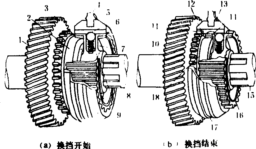 图3 同步器换档 1、10.齿轮; 2、18.外锥; 3.外锥与内锥接触; 4、13.拨叉; 5、17.啮合套; 6、14.内锥; 7、16.齿座; 8、15.输入轴; 9.弹簧压紧钢球在啮合套槽中; 11.啮合套与接合齿接触; 12.弹簧压紧钢球从啮合套槽中滑出 为了简化结构,变速箱普遍采用组成式结构。如图1中的组成式变速箱具有8个前进档、4个倒档。主变速具有4个档,副变速包括高、低档及倒档。主、副变速均用啮合套换档,某些变速箱的主变速采用同步器,以方便换档。 无级变速箱 应用动液力传动与静液压传动实现无级变速,在理论上可使发动机的功率得到最充分利用,但动液力传动效率较低,输出转速不稳定。农业拖拉机工作载荷相对比较稳定,很少采用动液力传动。工业拖拉机由于载荷变化较大,能充分利用动液力传动自动变速的优点,使用比较广泛。静液压传动具有布置方便,变速范围宽等优点,但传动效率也较低,仅在传递功率不大,功率损失不是重要考虑因素,速度控制要求精确而又需变速方便的情况下采用。