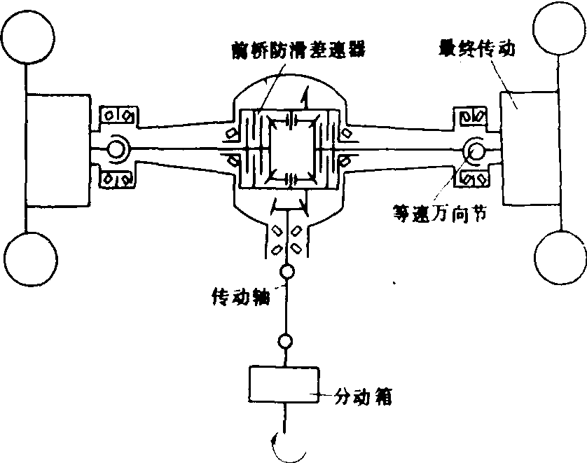图6 前驱动桥 中央传动与最终传动 拖拉机发动机转速和拖拉机驱动轮转速相差很大。除变速箱减速外,尚需大减速比的中央传动与最终传动。中央传动一般是一对大减速比的螺旋锥齿轮。最终传动是一对大减速比的圆柱齿轮或行星减速机构。 动力输出轴的驱动 不同型式的动力输出轴(见拖拉机动力输出轴),有不同的驱动方式:❶独立式动力输出轴由发动机经动力输出轴离合器及齿轮减速机构驱动。独立式动力输出轴离合器可以与主离合器安装在一起,也可以分开,各有独立的操纵机构。 ❷半独立式动力输出轴由发动机通过双作用离合器及齿轮减速机构驱动。双作用离合器由主离合器及动力输出轴离合器组成。两离合器由一个踏板操纵,踏板行程分二级:第一级控制主离合器的分离与接合;第二级控制动力输出轴离合器的分离与接合。 ❸非独立式动力输出轴由发动机经主离合器及齿轮减速机构驱动,另设脱开机构将动力输出轴在不工作时脱开。 ❹同步式动力输出轴由变速箱输出轴通过齿轮驱动,其转速与拖拉机行驶速度保持一定比例。 前驱动桥 常用于两轮驱动的变型四轮驱动拖拉机(图6),动力由分动箱经传动轴、中央传动、前桥防滑差速器、等速万向节、前桥最终传动传给前驱动轮。由于前驱动轮要相对前桥壳体偏转以进行转向,故前桥差速器与最终传动间设置等速万向节。折腰式四轮驱动拖拉机由铰接架前后部相对偏转进行转向,在铰接处设有等速万向节,其驱动轮相对桥壳体不需偏转,故其前驱动桥结构与后桥基本相同。 |