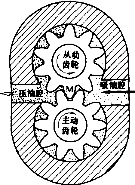 图1 齿轮泵工作原理 液压泵旋转一周所排出的油液容积为排量。定量泵的排量固定,变量泵则可变。单位时间内液压泵的输油量为流量,流量是排量与液压泵转速的乘积。液压泵进出口之间的压力差与流量的乘积是液压泵输出的液压功率。 液压泵按结构可分为齿轮泵、转子泵、滑片泵和柱塞泵等。 齿轮泵 为定量泵。常用的外啮合齿轮泵(图1)由一对渐开线圆柱直齿齿轮组成。齿轮齿顶与壳体内腔以及齿轮端面与壳体侧壁分别作为径向和轴向的密封表面,使各齿间形成封闭油腔。啮合点M将正在进行啮合的各齿隔开成左右油腔。齿轮按图示方向旋转时,右腔各齿退出啮合,容积扩大成为吸油腔;左腔进入啮合,容积缩小成为压油腔。 高压齿轮泵为了减少端面泄漏,前后轴套是轴向浮动的。出油道上的高压油液被引到轴套背面,把轴套压紧在齿轮端面上。压紧力与液压泵出油压力成正比,可减少由于压力升高而引起的端面泄漏。外啮合齿轮泵结构简单,造价低廉,体积小,重量轻,是在拖拉机和农机上应用最广泛的中高压液压泵。 转子泵 由短幅外摆线等距曲线齿形的内转子(主动)和圆弧齿形的外转子(从动)组成(图2)。内外转子齿数相差一齿,各自绕偏心距为e的两个中心旋转,方向相同。旋转时啮合点改变位置,形成了容积可变的各封闭油腔。右侧各腔吸油;左侧则排油。内转子每转一圈,每个油腔各完成吸油和排油一次。转子泵常用作中、低压液压泵。