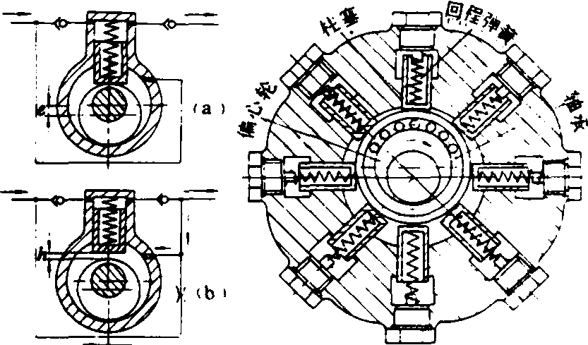 图4 轴向柱塞泵工作原理 1、4.斜盘; 2.变量活塞; 3.驱动轴; 5.压盘; 6.滑履;7、11.柱塞; 8.进油槽; 9.出油槽; 10.配流盘; 12.缸体 径向柱塞泵 各柱塞布置在垂直于轴线的同一平面内,由偏心轮推动柱塞压油。柱塞回程靠弹簧将柱塞压紧在偏心轮上。每一柱塞都有进出油单向阀。图5为径向柱塞变量泵工作原理图,当出口油压很低时[图5(a)],偏心轮室与进油道相通。柱塞紧贴偏心轮,行程为2e;当出口油压达工作压力时[图5(b)],通过控制阀将压力传到偏心轮室内并作用在柱塞底部,柱塞被保持在底部液压力与回程弹簧压缩力相平衡的位置上,脱离了与偏心轮的接触,实际行程减小,相应排量减少。因此,此泵可以在压力变化不大的范围内实现较大的流量变化,是恒压式变量泵。此泵用于大、中功率拖拉机上的恒压闭心液压系统中。