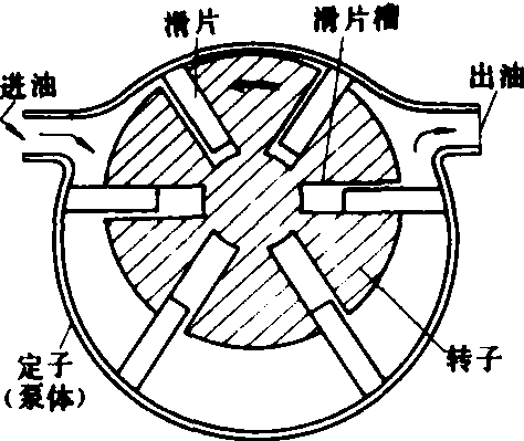 图2 转子泵工作原理 滑片泵 主要由转子、定子和在定子的滑片槽中作径向滑动的滑片组成(图3)。转子偏置在定子中形成了宽度不等的环形通道,并由滑片隔成容积不等的封闭油腔。当转子带着滑片旋转时,滑片在离心力作用下与定子内壁始终保持接触。各油腔随转子改变容积,完成吸油和排油。滑片泵常用作中、低压液压泵。
