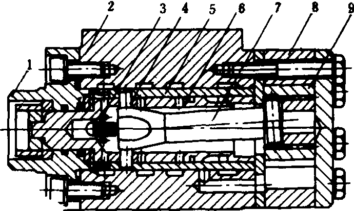 图1 摆线转阀式液压转向器 1.前盖;2.阀体;3.定中簧片;4.拨销; 5.阀套;6.阀芯;7.联动轴;8.定子; 9.转子 机械内反馈式系统主要由液压泵、液压转向器和转向液压缸组成。常用的摆线转阀式液压转向器(图1),又称奥尔比特(Orbit)转向器。系统作用原理如图2所示。方向盘不转动时,转向器控制阀在中间位置,转向液压缸两腔各自封闭,液压泵和油箱连通,导向轮位置不变,拖拉机或保持直线行驶,或保持一定回转半径转向。作用在导向轮上的侧向力,不能反应到方向盘上。转动方向盘时,由于克服了定中簧片的弹力,控制阀从中间位置移到转向位置,油泵来油经控制阀和转子计量器到转向液压缸,实现转向。转向液压缸另一腔的回油经控制阀返回油箱。方向盘停止转动后,控制阀在定中簧片的作用下,回到中间位置,导向轮停止转动。 反馈作用是通过转向器内部的转子、联动轴和拨销的运动,使阀套在转向过程中始终跟随阀芯运动而实现的,所以称机械内反馈。方向盘和导向轮之间的角传动比取决于转向器排量、转向液压缸容积和它们的容积效率。动力转向时计量器起计量马达作用,当发动机熄火或液压泵发生故障时,计量器起手动泵的作用实现人力转向。