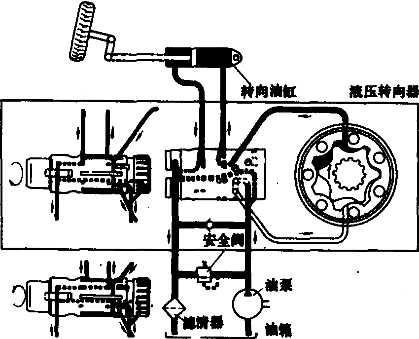 图3 液压外反馈静液压转向系作用原理 在转向过程中,由于反馈液压缸的作用,控制油路中总有一使控制阀回到中位的油压,如不继续转动方向盘,控制阀便回到中间位置。这就是液压外反馈作用。方向盘停止转动后,控制阀回到中间位置,两端压力相等,转向液压缸两腔各自封闭,液压泵输出的油仅作为补偿系统的漏损用。当发动机熄火或液压泵发生故障时,计量泵压出的油同时经控制阀进入反馈液压缸和转向液压缸,实现人力转向。此时转向角传动比较动力转向大得多,且转向油压较高,这和机械内反馈式人力转向恰恰相反。 履带拖拉机液压转向装置 可分两类:一类是在湿式转向离合器中直接设置液压缸,人力操纵液压控制阀,利用液压泵输出的压力油推动液压缸中的活塞,使转向离合器接合或分离。其接合或分离可分为三种型式:❶弹簧液压共同压紧,液压分离; ❷弹簧压紧,液压分离; ❸液压压紧和液压分离。另一类是在操纵系统中,设置液压助力器,驾驶员操纵助力器,使之推动转向离合器的分离机构,从而使转向离合器分离;接合时则靠弹簧压紧。使用要求驾驶员对转向离合器分离程度有感觉,即分离程度与操纵杆的移动应具有随动关系。 |