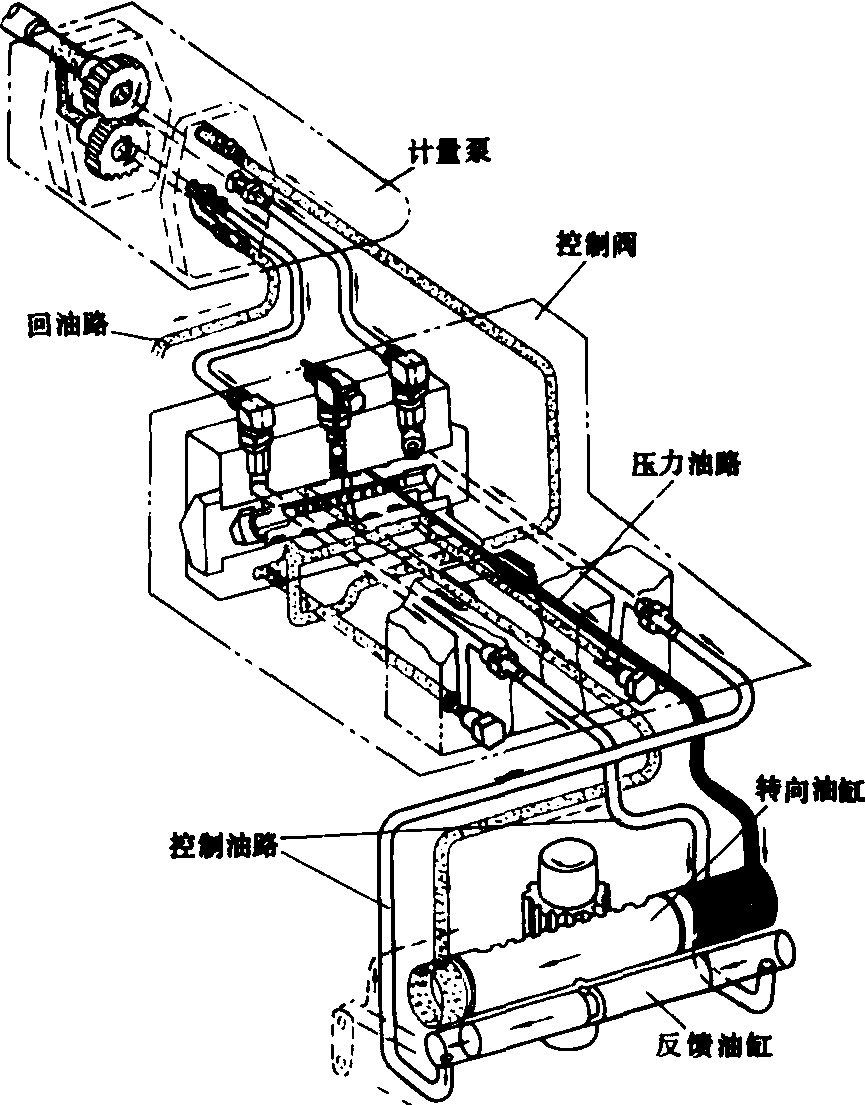 图2 机械内反馈静液压转向系作用原理 液压外反馈式系统主要由液压泵、齿轮计量泵、控制阀、转向液压缸和反馈液压缸组成。它与上述系统的主要不同点是计量泵和控制阀分置,控制油路和主油路分开,设有反馈液压缸。其作用原理如图3所示。当方向盘转动时,由于计量泵使控制油路产生压差,控制阀从中间位置移到转向位置,液压泵来油经控制阀进入转向液压缸,实现转向。转向液压缸回油经控制阀和计量泵回油箱。