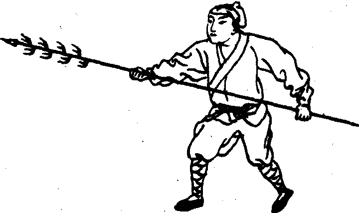 狼筅技法。此势主要用于防守。《纪效新书·狼筅总说篇》:“拗步退势,直进直出君须记,站住即是中平势。高低左右任君行,切挫钩闸毋轻易。