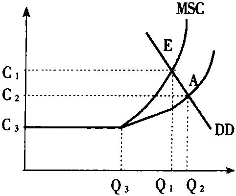 | 释义 | 拥挤成本Congestion Cost指驾驶者导致交通拥挤带来的成本(提高了他人的交通成本)。一般认为,社会成本=私人成本+外部成本,在没有交通拥挤现象时,驾驶者带给别人的拥挤成本为零。此时私人边际成本MPC(暂假定不考虑其他成分) 与社会边际成本MSC相等,即MSC与MPC两曲线重叠,但当车辆多到一定程度,超过如图Q3点时,交通开始拥挤起来,这时MPC与MSC开始产生差距,且越来越大,MSC实际上等于行车中的MPC加上对其他驾驶者因道路拥挤而引起的费用。假定这条公路上有几辆车,每辆车行驶的平均社会成本 (ASC) 为C,那么每加入车流一辆车造成的拥挤成本即车流的减速将使ASC增为C+Δc,在Q3点以后,车流量增为n+1,则MSC= (n+1) (C+ΔC)-nC=C+ΔC+nΔc,可以看出MSC比ASC多出nΔC,但该车主却认为他的MPC仅等于他能看得到的行车费用即等于C+ΔC,MPC与ASC相等。如果行车需求曲线是DD,MPC (ASC) 与之相交点为A,它决定的车辆数Q2,但是因为车主不考虑他对其他驾驶者造成的外部成本C1C3,道路上实际的车辆数必然为Q2,从而造成了过度的拥挤。