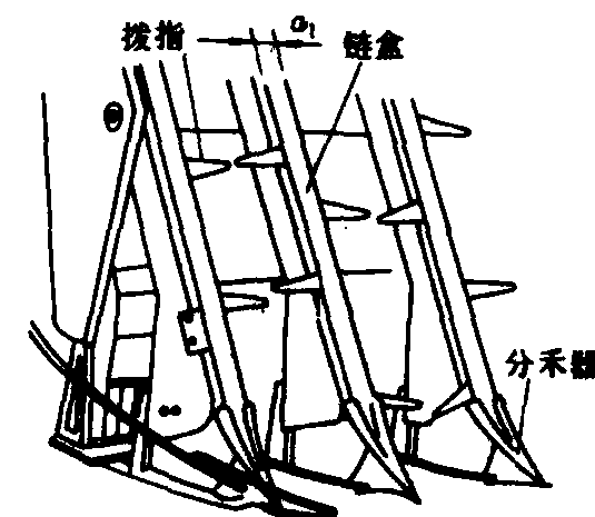 (b)倾斜面型 铅垂面型扶禾器 由扶禾链、拨指、上链轮、下链轮和链盒(拨指导轨)等主要部分组成(图4),拨指则铰接在扶禾链上。扶禾器倾斜地配置在切割器前上方。工作时,拨指随扶禾链作回转运动,同时又能绕铰接点作翻转运动。当拨指随扶禾链由上向下运动至下链轮处时,拨指受导轨控制而翻转伸出链盒外,同时在近地面处插入作物丛,随着拨指由下而上的运动,作物被扶起理直,然后在上、下拨禾星轮配合下,作物被切割器切断。此后,拨齿缩回链盒处于非工作状态,由上往下运动。切断后的茎秆则保持直立状态被送至切割器上方的上、下横向输送链。铅垂面型扶禾器的链盒宽度a1较窄[图3(a)],适用于窄行距、矮秆作物。它是中国半喂入联合收割机上采用的主要型式。