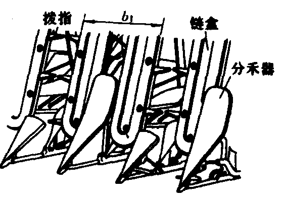 图4 铅垂面型扶禾器的结构 1. 分禾器; 2. 拨指; 3. 下链轮;4. 链盒(拨指导轨); 5. 上链轮;6.扶禾链; 7.上拨禾星轮; 8.上横向输送带; 9.挡板; 10.下拨禾星轮;11.下横向输送链; 12.切割器 倾斜面型扶禾器 主要特点是拨指在扶禾链回转平面内运动,工作比较平稳。它相邻两链盒形成的无拨指区b1[图3(b)]较宽,约400毫米左右,作物在此处发生较大横向倾斜的状态下被切断,对窄行距或矮秆作物会产生高割茬或漏割等现象。 |