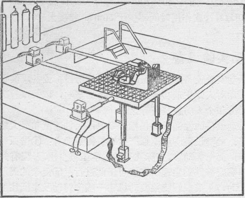 六自由度振动台 此设备使用液压系统致动。由6个液压作动器,经6支拉杆和12只万向接头,分别沿水平和垂直方向与一个面积为1.5×1.5m2的实验平台相连接。工作时,由大型计算机对有关方程和给出信号进行运算转换,控制逻辑线路从相位和幅度方面统一协调各个液压作动器的动作,使平台作上下、前后、左右、滚转、俯仰及偏航共6个自由度的任意组合的振动,因而可模拟飞行器在各种方位和姿态的振动。美国空军航空航天医学研究所此项设备(代号SIXMODE)的主要性能参数为:频率0~30Hz,能按不同组合给出沿X、Y、Z轴的三种直线振动;以及在Z轴最大振幅为127mm条件下,滚转和俯仰均可达15°、偏航为10°的三种角振动;在最大试验载重(900kg)条件下,加速度值可达20G。设备上装有周密的安全连锁装置,在超过规定G值时可自动削减输入信号,开车、停车时输入信号能自动平稳地逐渐出现与消失,突然断电时自动解除油压等。