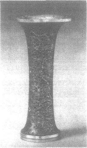 明景泰年间制品,现为北京故宫博物院收藏。器高14.5厘米,口径7.9厘米,足径4.1厘米,铜胎镀金。口底外撇,圈足,轮廓线为两条流畅的弧线,器形单纯精巧。通体饰缠枝莲纹,掐线匀密,施浅蓝、红、黄、白、豆绿、黄绿、蓝七种釉色,以蓝色调为主,色彩和谐。器下部花间嵌一镀金铜长方片,阴刻楷书“大明景泰年制”款。器内镀金錾花铜胆和足底为后配。