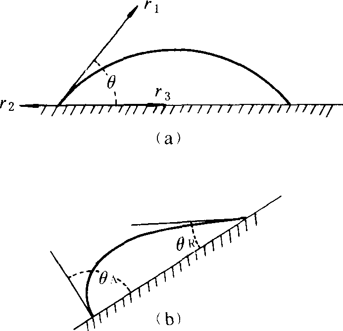 种类 有前进角与后退角两种。❶前进接触角(或推进接触角,advancing contact angle,θA)。把药液滴加到物体表面上时所形成的接触角,或物体表面发生倾斜时液滴流动,在液滴流动的前沿所形成的接触角(图1b)。 ❷后退接触角(或退缩接触角,recedingcontact angle,θR)。把已沉积在表面上的液滴吸去一部分,液滴的周边退缩后所形成的接触角,或物体表面发生倾斜时液滴流动后,在后缘部所形成的接触角(图1b)。前进接触角可用于表达药液的展开能力并用以计算展开系数;后退接触角用于表达药液的润湿能力。此外,因为植物体或昆虫体的任何部分都没有绝对的水平面,研究液滴的前进接触角和后退接触角对于液滴的持留能力和稳定性可提供分析依据。一种不湿润的液体其前进接触角和后退接触角均很大,因此在表面上处于不稳定状态而很容易发生滚落。在表1中的(θA-θR)差值越小即表示液滴越不稳定。 表1 液体在不同表面上的接触角