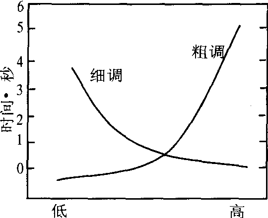 如果粗调与细调用同一个控制器完成,则应选择最佳的控制-显示比,使总调节时间(粗调时间+细调时间)减到最少。最佳控制-显示比是在图中两条曲线的交点附近的某个位置上,它的数值大小取决于控制器的类型、显示器的大小、调节误差容限和其他的系统参数。对于一个特定的控制器,应该根据实际操作条件,通过实验确定它的最佳控制-显示比。