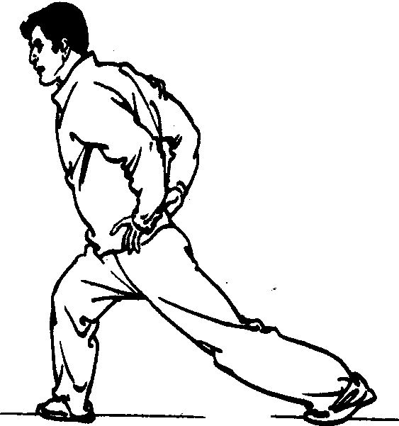 通备劈挂拳步型。前腿屈膝半蹲,足尖外展;后腿伸膝蹬直,足跟提起,前脚掌着地。两脚相距与弓步相同,上体正对前方。