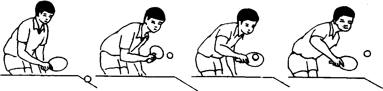 教学重点 ❶徒手搓带轴球或自抛自搓一板球练习。体会各种搓球的击球时间和拍形角度变化。 ❷搓对方发过来的下旋球练习。先练慢搓后练快搓,体会手腕配合前臂旋内转动的前送动作和击球时间。 ❸对搓练习。提高搓球动作的协调性、节奏感。 ❹正、反手搓回对方一点练习。加强正、反手搓球的落点及旋转变化。 ☚ 正手拉前冲弧圈球 削球 ☛ 搓球 搓球是用球拍搓切球托的侧下底部,使球产生向侧旋转翻滚过网。它是将近网球还击到对方近网区的击球方法之一。搓出的球越贴近网,旋转翻滚的性能越强,对方回击球就越困难,进而为自己创造进攻的机会。搓球分为正手搓球和反手搓球。正手搓球用正手握拍,球拍随着前臂伸向右前上方斜举。当球拍举至最高点时,前臂开始向外旋转,手腕稍后伸。击球时,前臂稍外旋,手腕由后伸至稍内收闪动,握拍手的食指和小指轻握拍柄,使球拍在手腕和食指的挥摆用力下,搓切来球的右下底部,使球旋转翻滚过网。反手搓球用反手握拍,前臂稍往上举,同时手腕前屈,手背约与网同高,而拍面低于网顶。搓球时,主要靠前臂的前伸外旋和手腕由内收至外展的合力,搓出球的右侧后底部,使球侧旋滚动过网。(见图2—3—29)