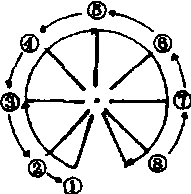 2.动作(以8拍为一动作循环): 单数组:1~4拍1号从预备姿势开始,两臂按顺时针方向做匀速绕至左侧下道具触地。2~8号也从预备姿势开始,两臂先按逆时针方向匀速绕至右侧下经道具触地后再按顺时针方向绕。5~8拍动作同1~4拍组,方向相反。 双数组:1~4拍1号从预备姿势开始,两臂按逆时针方向匀速绕至右侧下道具触地。2~8号也从预备姿势开始,两臂先按顺时针方向匀速绕至左侧下经道具触地后再按逆时针方向绕。5~8拍动作同1~4拍,但方向相反。在做动作时两臂1拍绕90°,但动作要连续不可停顿,身体随臂的高低做起伏动作。此动作反复进行即可形成摆龙。