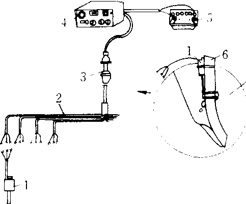 播种监视器 1.传感器 2. 电线 3. 柱塞联轴器 4. 监视仪 5. 蓄电池 6.导种管 7. 开沟器 |