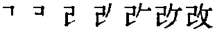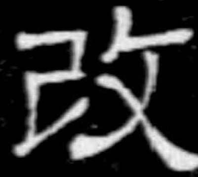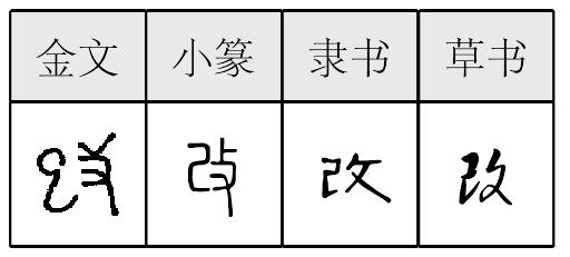 改❶改变:~革︱~良︱~善︱~造︱~建︱~进︱~动︱~易︱~日︱~天︱~期︱~判︱~选︱~装︱~锥︱~组︱~口︱~嫁︱~元︱~制︱~辙︱~道︱~行(hang)︱~观︱更(geng)~︱篡(cuan)~︱~天换地︱~朝换代︱~名换姓︱~头换面︱~弦更(geng)张︱~弦易辙︱面不~色︱朝(zhao)令夕~。 ❷修改:~订︱~写︱~编︱~卷︱~窜︱涂~︱窜~︱批~︱删~︱校(jiao)~。 ❸纠正:~过︱~悔︱~正︱悔~︱~过自新︱~邪归正︱痛~前非︱屡教不~︱有则~之,无则加勉。 改gǎi❶ 变更,更换:改变│更改│改革│改头换面│改换门庭。 ❷ 修改:改编│涂改│篡改。 ❸ 把错的变成对的:改正│悔改│痛改前非│屡教不改。 ❹ 姓。 改(10次) ❶改变。何不~乎此度 羌中道而~路偭规矩而~错 来违弃而~求《离》前图未~《章·怀》 未~此度 未~此度也《章·思》 背绳墨而~错《辩·五》灭规榘而~凿《辩·六》 ❷改变。引申为克制。惩违~忿兮《章·怀》 改gǎi❶变更;变异。《说文·己部》:“改,更也。”《周易·井》:“改邑不改井。”《逸周书·常训》:“天有常性,人有常顺。顺在可变,性在不改。”《离骚》:“何不改乎此度?” ❷ 改正。《周易·益》:“君子以见善则迁,有过则改。”姜亮夫通故:“改实含两义,一则本质之更易,如‘改操’此改字有改革义;一则量之损益,如‘改度’,‘无可改’等皆是。以今语译之,即所谓改良矣。”《天问》:“悟过改更,我又何言?” 改gǎi(用螺丝刀)旋。如:把螺丝钉儿~下来。 改gai改扮 改编 改变 改产 改道 改点 改订 改动 改革改观 改过 改行(hang) 改换 改悔 改嫁 改建 改进 改口 改良 改判 改期 改日 改善 改天 改线 改写 改选 改样 改元1 改造2 改正 改制 改装 改组 窜改 篡改 更改 房改 悔改 教改 劳改 批改 评改 删改 审改 涂改 修改 整改 劳改犯 改朝换代 改恶从善 改革开放 改过自新 改换门庭 改名换姓改天换地 改头换面 改弦更张 改弦易辙 改邪归正 痛改前非 累教不改 闻过即改 限期整改 朝令夕改 江山易改,本性难移 行不更名,坐不改姓 改gai❶改换;变动:上班时间~了|现在~主意还来得及|这家公司~了名儿|你的脾气得~一~了|社会风气~好了。 ❷修改:我~了几个错别字|这篇文章得~短一点儿|窗框稍微~~就行|这计划经过试行,需要再~一~。 ❸改正:痛~前非|~~你那些老毛病|有缺点、错误不要紧,~了就好了|你不讲卫生的坏习惯要彻底~掉|这种不良作风很难~过来。 改(同)换 更 变 改gǎi❶改正(习性):还是这个毛病儿,多早晚才~。(二一·461)他若是真~了,是他一生的福;若不~,妈也不能又有别的法子。(四八·1105) ❷改变:堪破三春景不长,缁衣顿~昔年装。(五·109)其模样虽然出脱得齐整好些,然大概相貌,自是不~,熟人易认。(四·83) ❸修改:我倒有一件大毛的,我嫌风毛儿出不好了,正要~去。(五一·1187)