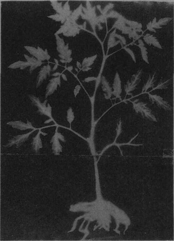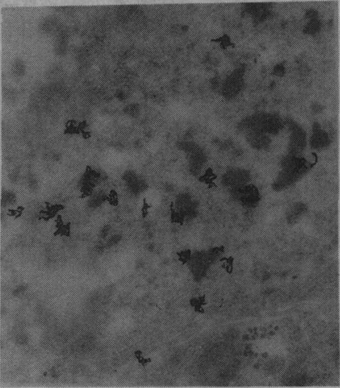 图1 32P在番茄植株中分布的自显影片 电镜自显影(EMARG) 其特点是切片很薄(50~100纳米),源弱,观察分辨力高。因而要求单层乳胶膜,膜坚固,能耐受电子的轰击,溴化银的晶体颗粒细而密度大(图2)。单层乳胶膜的制作常用金属环套法,将在铂金环中形成的半凝固态的单层乳胶膜覆盖于喷有碳膜的铜网切片上。晾干后,于暗盒中低温下曝光一定时期后,在D-19b显影液中(18~20℃)显影2分钟,25%硫代硫酸钠定影3分钟,去离子水洗净,去明胶,染色,在电镜下观察银颗粒的分布,分析在亚细胞结构或生物大分子中的标记部位。也可用浸渍法或平板法制作单层乳胶膜。