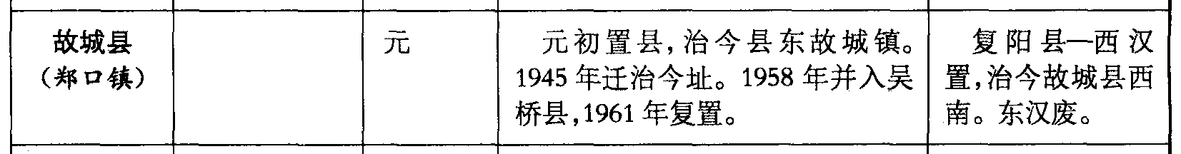 故城县(郑口镇)元元初置县,治今县东故城镇。1945年迁治今址。1958年并入吴桥县,1961年复置。复阳县—西汉置,治今故城县西南。东汉废。