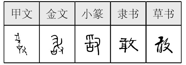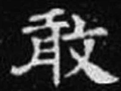 ❹ 强毅果敢 敢gǎn (金) 金文为形声字,“争”形,“甘”声。篆、隶发生了变化,声、形已难识辨。小篆由爪、古、攵合成(《九经字样》),意为双手去抓“古”,“古”是一种野兽的变形。徒手生擒猛兽是勇敢的表现。可属会意字。作声符生成的字有: gǎn 橄(橄榄) kàn 瞰(鸟瞰图) han 阴平:憨(憨厚) 上声:阚(同“㘎”,虎吼叫) 去声:撖(姓氏)