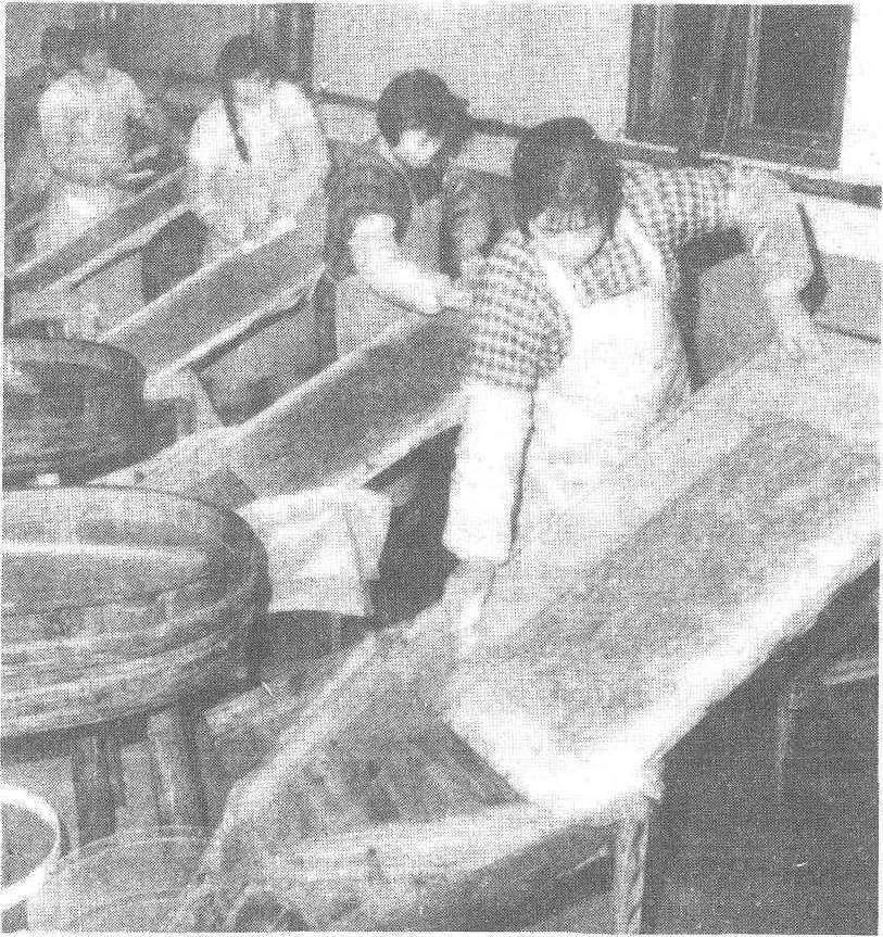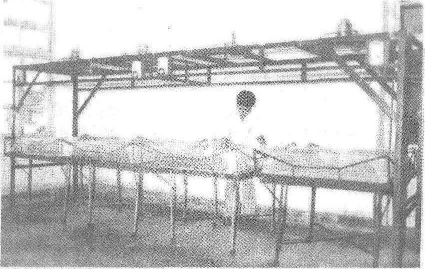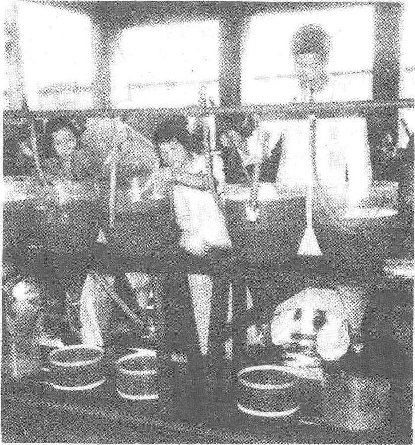 图6 散卵自动称量装盒 平附种改成散卵:将平附种用盐酸浸渍脱粒,已有消毒作用。浸酸标准是盐酸稀释液比重1.075,液温46℃,浸渍6分钟。脱酸水温须经28℃→20℃→15℃的中间水温各5~10分钟,然后投入10℃清水中脱净酸味,进行盐水比重选卵。倘脱酸直接放入10℃~15℃水中,将使蚕卵骤感变温而产生白死卵,且使卵胶凝结增加胶着卵,影响比重的准确性。 散卵蚕种loose silkworm eggs产卵在上浆夏布或蚕连纸上,经浴种消毒或浸酸洗落蚕卵,定量装盒而成的蚕种。装在木纱制或塑制的散卵盒内,是目前普遍采用的普通蚕种制种型式。每张夏布或蚕连纸上投放一定数量(因品种,生产季节等而异)的母蛾产卵。散卵蚕种洗落后可经过盐水比重选卵,淘汰不良卵,提高蚕种品质;定量装盒,使蚕种卵量规格化。制种管理方便、省工。但蚕卵洗落、消毒、比重等蚕种浴消工序较平附种多。 |