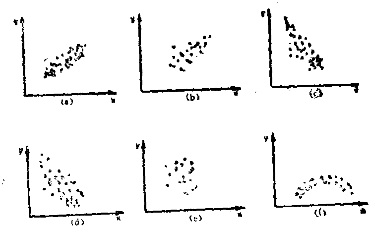 通过分析两种因素的数据之间的关系,来控制影响产品质量相关因素的一种方法。在因素分析中,通常遇到一些变量共处于一个统一体中,有些变量之间存在着确定的关系,有些变量之间并无确定的关系,但存在相关关系,这就不能由一个变量的数值精确地求出另一个变量的数值,只有将两种有关的变量数据列出,并用点子打在座标图上,以观察两种因素之间的关系。这种图就叫散布图或相关图,对这种图的分析就叫相关分析。相关图一般有以下六种形式:
