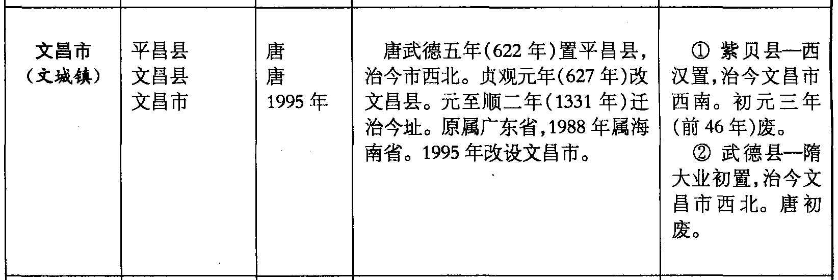 文昌市(文城镇)平昌县文昌县文昌市唐唐1995年唐武德五年(622年)置平昌县,治今市西北。贞观元年(627年)改文昌县。元至顺二年(1331年)迁治今址。原属广东省,1988年属海南省。1995年改设文昌市。❶ 紫贝县—西汉置,治今文昌市西南。初元三年(前46年)废。❷ 武德县—隋大业初置,治今文昌市西北。唐初废。
