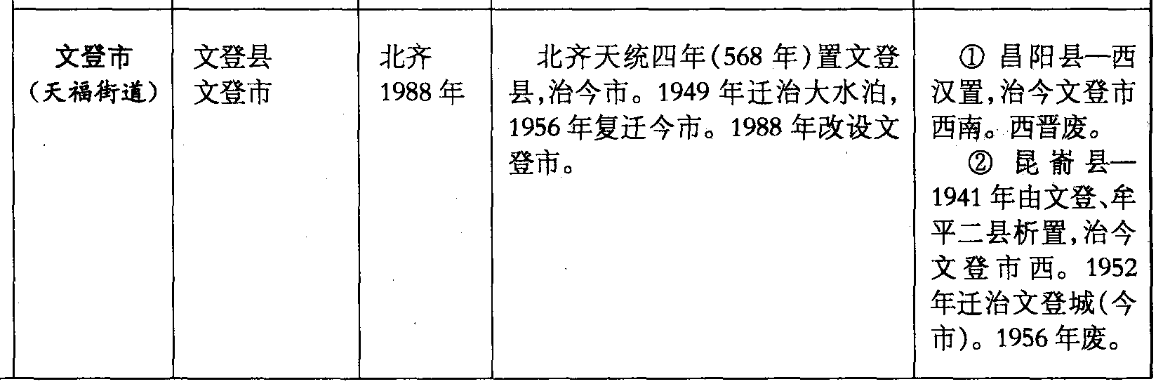 文登市(天福街道)文登县文登市北齐1988年北齐天统四年(568年)置文登县,治今市。1949年迁治大水泊,1956年复迁今市。1988年改设文登市。❶ 昌阳县—西汉置,治今文登市西南。西晋废。❷ 昆嵛县—1941年由文登、牟平二县析置,治今文登市西。1952年迁治文登城(今市)。1956年废。