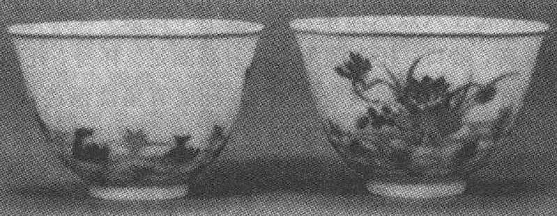 清代康熙时期斗彩瓷器。高三点八厘米,口径五点八厘米,足径二点三厘米。侈口,薄唇,深腹,平底,矮圈足。胎薄,洁白细腻,白釉莹润,略为泛青。外壁绘“莲塘鸳鸯图”。在杯体最窄狭处的下腹部,只突出一朵荷花和两只鸳鸯,荷花叶较大,筋络突出,叶上五个圆圈表示水珠,荷花由十三瓣组成,根部较宽,露出白色,表示荷花的高洁。另一朵荷花较小,荷叶向上,呈刚刚绽开状。鸳鸯为雌前雄后,追逐戏水。水里十三朵水藻和成网状散开的淡蓝色水波,画得较虚,这是一种极富匠心的烘托。底足用青花书“大清康熙年制”双行六字楷书款识,外加双圈。现藏于香港天民楼。