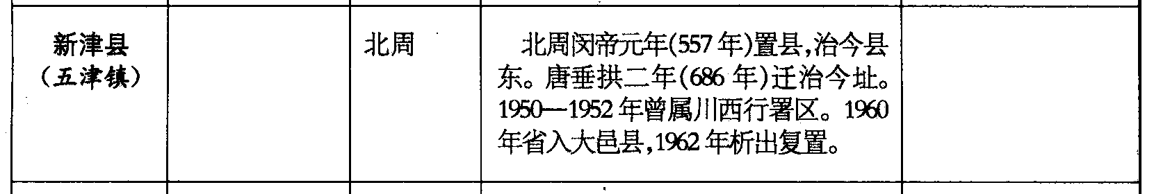 新津县(五津镇)北周北周闵帝元年(557年)置县,治今县东。唐垂拱二年(686年)迁治今址。1950—1952年曾属川西行署区。1960年省入大邑县,1962年析出复置。