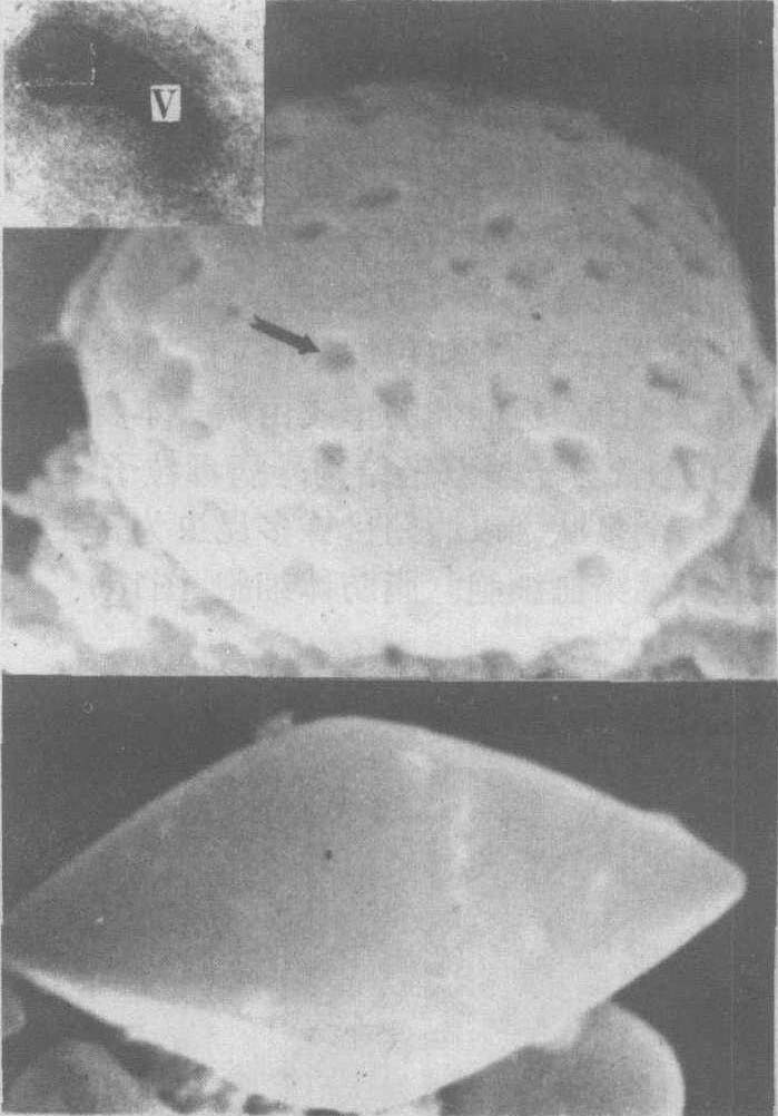 颗粒体病毒 包涵体是一个椭圓形或卵圓形的小颗粒。光学显微镜下几乎接近于分辨率的极限。通常一个颗粒体只含一个杆状病毒粒子,偶然有2个以上的。有些畸形颗粒体比正常者长几倍(左图箭头所指)。颗粒体病毒形态发生较为特殊,有的结晶状蛋白沿着核衣壳从一端往前堆积,也有从核衣壳两端延伸堆积,逐渐形成一个完整的颗粒体。属于B亚组的颗粒体病毒可侵染脂肪体细胞,体壁细胞、气管底膜细胞和中肠肠壁细胞等;可在核内或细胞质内复制增殖。感染途径与NPV同,经口和卵传染,易潜伏感染。罹病早期幼虫外观病征不明显,后期色泽变淡,腹面呈乳白色,体节肿胀,虫尸易液化,体液混浊含有大量的颗粒体病毒。发病过程较长,一般需5~25天死亡。寄主范围特异性较高,很少有不同科、属间相互感染的现象。其遗传物质是双螺旋结构的DNA,分子量较大。主要侵染鳞翅目的多种昆虫。是一种有应用前途的微生物杀虫剂; 中国研究的菜青虫GV等已获较好防治效果,国外对CV的研究和应用也有成功之例。
