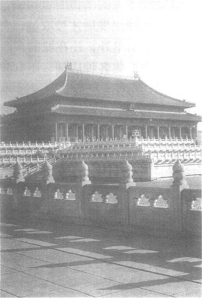 从景山鸟瞰紫禁城 ☚ 明中都临濠宫殿 太和殿 ☛ 明清紫禁城 明清紫禁城明清二朝的皇宫。明成祖永乐十五年(1417)始建,历时18年建成,呈长方形,位于北京城中轴线上,南北长961m,东西宽753m,由宽52m的护城河和10m高的城墙环绕,四角建角楼,四面各有一门,沿南北中轴线分为外朝和内廷南北二区,由宫城正门 “午门” 进入第一进院落,是正对太和门的长方形广场,通过横穿广场的金水河上五座汉白玉桥,进入宏伟高大的太和门,是中国现存最大的殿庭,占地达85000m2。在高8.2m的工字形三层汉白玉台基上,前后布置着太和、中和、宝和三座大殿。外朝主殿太和殿面积达2770m2,是中国现存最大的古建筑,面阔11间,重檐庑殿顶,室内净高达14m,是皇帝上朝听政的地方,中和殿是皇帝休息的场所,宝和殿则举行殿试和宴会外宾。前三殿后是内廷主要部分; 进入乾清门,中轴线上依次为帝、后正式起居的乾清宫、交泰宫和坤宁宫,形制同三大殿,规模缩小,占地为前朝殿庭的四分之一。通过坤宁宫后的坤宁门是面积约11200m2的御花园,园内主要亭榭也对称布置。宫城主要建筑前朝大殿的二侧分别布置大小院落,是皇帝日常办公或召见大臣的地方,后三宫的东西二侧对称布置东西六宫及皇子、皇太后的居所。紫禁城的布局轴线突出,主次分明,形成统一中富于变化的空间序列,是中国古代庭院式建筑布局的典范。