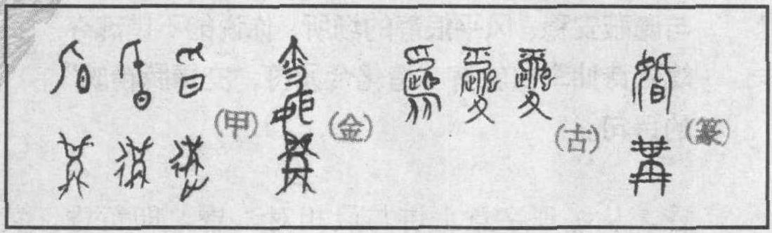 甲骨文一款的 “昏” 从人 (或从匕),从近似“日”的形状,像女阴,为会意字。“日”除标意为太阳外,还有性接触的用意。按后世的传统解释是,日在人下会意为黄昏的 “昏”。二款的 “昏”,从氏从日,“氏”是父系血统的用字,在这里是男性的标意,“氏”下“日” 也当会为性交。三款的 “昏” 从爪从日,覆手为爪,“爪”在这里具操作、实施、授受、约定之意,“爪” 下“日”也当会为性交。如果说甲骨文的“昏”用于性交的标意过分隐匿的话,那么籀文的三个“昏”字就与我们兜了一个大圈子。籀文一款的 “昏”,从 “爪” 从 “己” 从 “止” 从 “士”从“从”,似乎写了一篇不成逻辑的文章,让我们解读。“止”古意为趾,在这里用作至意;“士”是甲骨文时的形体,九十度的倾斜,“士”男性性器;“己”按五行学说为中央土,《释名》:“言己以别于人者”,“己在中故以收敛辟藏为要”,“己”在这里用为隐蔽之意。“从”原本与“比”、“尼”、“北”一样均取象于上古群婚时的男女媾合与两性接触。“从”在这里具“允从”、“默契”之意。全字提供给我们的信息是:男性带上“士”到(止)早己约 (爪) 定好的避静 (己)之处相幽会 (从)。籀文二款的“昏”,将“己”变作“人”,将 “从”变作 “夂”,将 “士”变作 “巳”,增加八卦易经体阴性符号“‖”。“夂”(音随),在甲骨文时是左脚的标意符号, “⼡”在这里与“从”同意; “巳”在古字里是按精虫用意的;“‖”在这里是女阴的用意。籀文三款的“昏”,将 “人”与阴性符号 “‖”变作金文时的 “它”和小篆时的 “六”,这些都是过去人们公认的女阴用字。如果说甲骨文的“昏”只带有男女性别符号使人难以理会的话,那么,籀文的三个 “昏”字就是三幅野合图。 “昏”,殷卜用作太阳下山,即黄昏,“旦至于昏不雨”,是说从早晨到傍晚没有下雨。金文的“昏”除增加一“女”形外,其它构形已讹变得使人难以辨认。《诗经·陈风·东门之杨》: “东门之杨,其叶牂牂。昏以为期,明星煌煌。”可翻译为: 东门外的白杨树,叶子长得真茂密。约好黄昏来这里,却怎么星光灿灿不见人。把等候情人的焦灼心情描写得十真切。欧阳修也有 “月上柳梢头,人约黄昏后” 的佳句 (《生查子》)。上古时的 “昏”用于名词和动词没有区分,小篆时 “昏”才一分为二,“昏”作名词用,“婚”则用于男女在黄昏时的野外相约、媾合与交欢。并将羽状复叶朝舒昏合象征夫妻合欢的落叶乔木称 “棔”。 “昏”的本意是黄昏时男女的野合婚媾。据说 “黄昏”一词在日语中原是 “谁呀?他是……”的意思。这是“黄昏”内容前奏的特写镜头。语言随着时代而发生变化,这是很自然的事,而 “黄昏”的这一特写,穿越时空几千年,却由日本在语言中保留了下来,实在是化石级的品位。随着父系社会的确立,家庭的出现,偶婚制逐渐形成与男权的占有,“昏”又是抢婚的好时机,所谓 “掠美为婚”。夜幕降临,一帮子人闯入女家,将新人拥走,这是从野蛮开始,又以文明收场的婚姻嫁娶的习俗,据说不抢不足以提高新人的身价。至今我国有些民族仍在沿袭这种文明。自“昏”加 “女”成 “婚” 以后,由群婚时的 “昏媾”,偶婚时的 “掠婚”,“昏”又变成了 “娶妻之礼,以昏为时,取阳往阴来之意”。“昏” 即 “婚”,《诗经·邶风·谷风》: “宴尔新昏,不我屑以。”这是被遗弃的妇人控诉她的丈夫,新婚以后不再理睬自己。古时婚娶在达官贵族那里还有一种形式叫 “师婚”,据说夏桀得妹喜、殷辛得妲己、周幽王娶褒姒、晋献公娶骊姬都是以战争的手段解决问题的。现在 “昏”的时段无限延伸,“阍门”也无人看守,昔日那些诸如以兴师抢掠而得到女人的作法统统显得繁缛与多余,某些达官新贵、腕派人物满可以凭借自己的一时得势,对女人施行擒获,这里不光有天昏,还有人的头惛。 现在说“冓”。冓的取象来自古代人们捕鱼时编织的鱼篓。甲骨文一款的“冓”正是这种捕鱼工具的素描。这种工具是用竹篾编成,竹茬向内,一般以两个竹篓子为一对系绳子放入河鱼常于游向的水中,鱼儿一旦进入就不易出来。收篓时得慢手抻提,于是就产生了“冉”字; 提篓时也得用力适度,故后来又有“爯”、“偁”、“稱” 等字的孳乳。二款的 “冓” 增加行符“彳 ”; 三款的 “冓” 又在二款的基础之上增加“止” 为“遘” 的原字,其意义未变。又因“冓”有结对、成双、连结、双方、相遇、相交之意,于是便产生了構、溝、媾、遘、購、覯、鞲、篝和斠、講等字。“冓”原本为鱼篓,《诗经·邶风·谷风》:“毋逝我梁,毋发我笱。”梁即拦鱼的水埧,笱即捕鱼的竹篓。这是被遗弃的妇人警告她的丈夫不要走上她的水埧,不要打开她的鱼篓。喻指不要与她接触并发生性关系,篓,隐指女阴; “水埧”、“鱼篓” 都是隐语廋词。“冓”殷卜用作相遇,“贞,冓于御方”,意思是说经过占卜,和御方相遇。“其遘大风?吉”是说可能遇上大风,但不会出现什么灾祸。“贞,其冓雨,四月”是卜问四月能否遇上雨。金文的“冓”与甲骨文一脉相承。小篆的“冓”将原本的斜画一律变作横直笔画,这就给许慎造成了一个不小的误区,《说文》: “冓,交积材也,象对交之形,凡冓之属皆从冓”,他完全按照小篆形体望文而生。小篆用于表意男