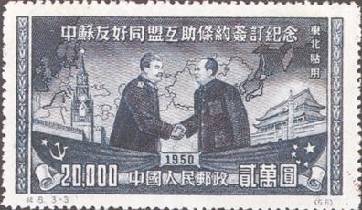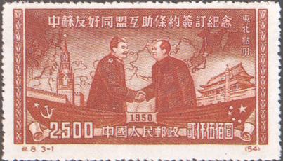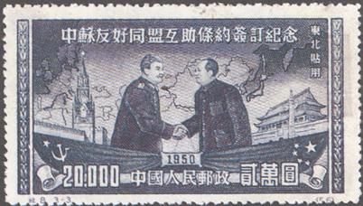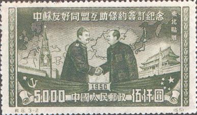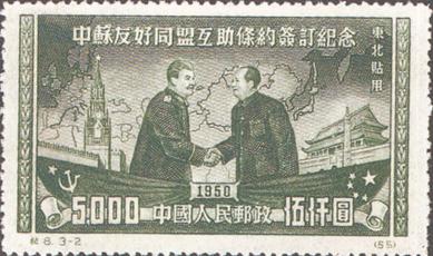 | 释义 | 中苏友好同盟互助条约签订纪念(东北贴用) 发行日期:1950年12月1日 齿孔度数:14 印刷版别:雕刻版 图幅:50.5×28 全张枚数:50(5×10) 原画作者:王式廓 设计者:孙传哲 雕刻者:刘国桐 币制:东北币 印刷:北京中国人民印刷厂