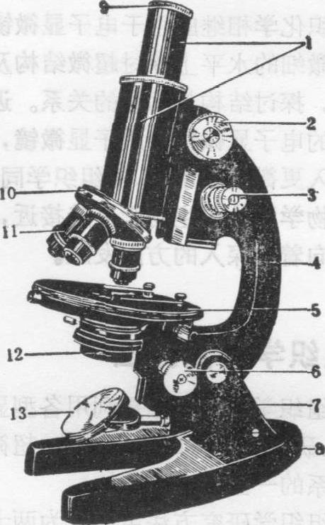 | 释义 | 普通光学显微镜 普通光学显微镜普通光学显微镜是观察有机体器官、组织和细胞微细结构的光学仪器。显微镜包括机械部分和光学部分。机械部分由镜座和镜柱、镜臂、载物台、镜筒、物镜转换器和调焦螺旋组成。光学部分包括接目镜、接物镜、聚光器和反光镜。镜座和镜柱是支持和稳定显微镜的主要部分。镜臂是连接镜柱上端和镜筒的弯曲部分。镜臂与镜柱的连接处为活动关节,可使显微镜向后作一定角度的倾斜,以便于观察。载物台为安装在镜柱上放置标本的平面台,有方形和圆形两种。台中央有一圆孔可使照明光线通过。台上附有一对弹簧夹或带有刻度的标本推进器。镜筒是附在镜臂上端前方的圆筒,它是成象光柱的通道,镜筒上端装有接目镜,下端装有物镜转换器。物镜转换器为圆盘状,有3~4个物镜孔。各种倍数的物镜安装在物镜孔内。调焦螺旋分粗调螺旋和微调螺旋两种。旋转调焦螺旋时可升降镜筒或载物台,以调节焦距使物象清晰。粗调螺旋调节范围较大,每转一周可使镜筒或载物台升降10mm。微调螺旋的调节范围较小,每转一周,镜筒或载物台仅升降0.1~0.2mm。接目镜装在镜筒上端,标有放大倍数5×(5倍)、8×(8倍)、10× 10倍)和15×(15倍) 等。接物镜装在物镜转换器上,一般有10×、20×、40×和100×(油浸镜)。聚光器装在载物台的下方,它聚集由反光镜反射的光线,使之通过载物台的中央孔透过标本。聚光器也有调节螺旋使其在一定范围内升降,调节光线进入物镜的聚集程度,有助于调节成象的景深。聚光器内附有光栅,可开大或缩小以调节光线的强弱。反光镜安装在聚光器下面,一面为平镜,另一面是凹镜(见图)。