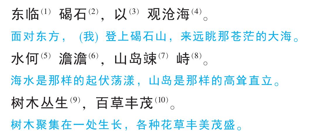 东临(1)碣石(2), 以(3)观沧海(4)。 水何(5)澹澹(6), 山岛竦(7)峙(8)。 树木丛生(9), 百草丰茂(10)。 秋风萧瑟(11), 洪波(12)涌起。 日月之(13)行, 若出其(14)中; 星汉(15)灿烂, 若出其里。 幸(16)甚(17)至(18)哉, 歌(19)以咏志。