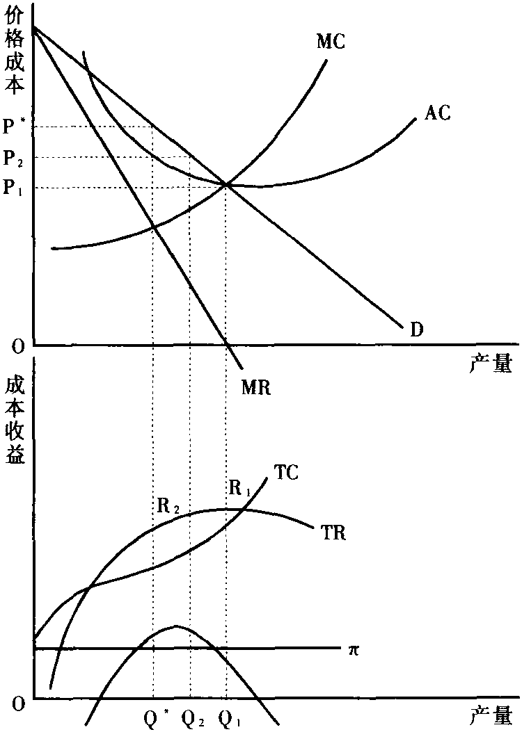 企业理论表明,在利润最大化以后继续增加产量(或销售量)必将减少利润。鲍莫尔主张最大化销售量,但也追求最低限度利润,即起码的目标利润。如图中P*和Q*为利润最大时的价格和产量。企业若只追求最大总收益,则价格和产量应为P1和Q1,总收益为R1。企业若只想有一个最低限度的利润(假设为π),那就应该生产Q2,定价P2。此时的Q2就是能保证企业获得最低限度利润π的最大产量,相应的总收益为R2。这就是鲍莫尔模式的基本点。