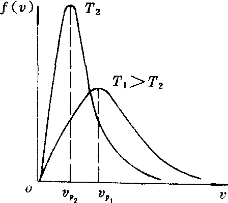 其中k是玻耳兹曼常量,R是气体常量,T是热力学温度,m是一个分子的质量,μ是摩尔质量。对同 一种气体(m相同),温度升高时最概然速率vp增大,分布曲线的峰向右移,如图1所示,与T1对应的最概然速率是v