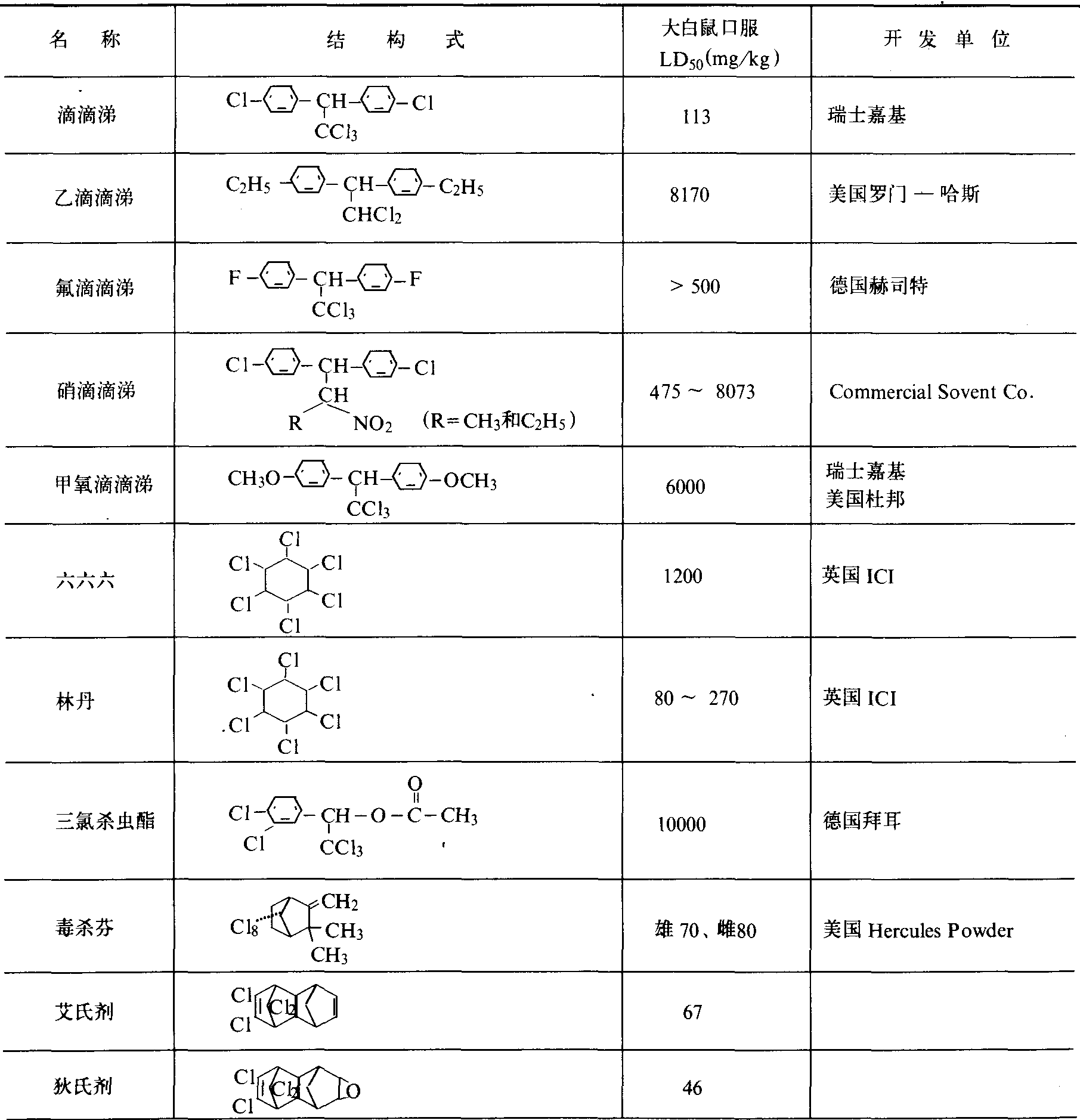 有机氯杀虫剂organ ochlorines insecticides一类含氯有机合成杀虫剂,也是发现和应用最早的一类人工合成杀虫剂。20世纪40~ 70年代,在全世界广泛使用,在防治农林、卫生害虫方面,发挥过重大作用。70年代后,大部分品种相继被限用或禁用。 简史 有机氯杀虫剂主要是滴滴涕(DDT)和六六六(BHC)。滴滴涕是1874年德国蔡德勒(D.Zeidler)合成的,但其杀虫活性却是瑞士缪勒(P.Muller)于1939年间才发现的。1940年,瑞士嘉基(Geigy)公司开始生产。在第二次世界大战期间,广泛用于灭虱和灭蚊,对控制斑疹伤寒和疟疾的传播起了重大作用,挽救了几千万人的生命。六六六为1825年由法拉弟(M.Faraday)首先合成。1912年荷兰凡· 德· 林登(Van der Linden)发现六六六为含四个同分异构体——甲、乙、丙、丁的混合物。后来又陆续发现了另外三种同分异构体和少量七氯和八氯环己烷。1941年英国和法国先后发现了它的杀虫活性。英国卜内门(ICI)公司在40年代进行了系统的开发工作,证实丙体活性最高。为纪念林登,特把含丙体99%以上的六六六命名为林丹。滴滴涕和六六六一样,在40~70年代,也是世界上吨位最大,使用最广泛的杀虫剂,在防治农林害虫和卫生防疫方面发挥过重大作用。 20世纪40年代后期到50年代初期是有机氯杀虫剂大发展时期。这期间开发的类似DDT品种有:乙DDT(pherthane)、氟DDT(DFDT),硝DDT(dilan)、甲氧DDT(methoxy chlor)等。但其使用的范围和吨位,都远不如DDT,而其稳定性都较滴滴涕差,速效性较快,残效性较短,对环境污染轻。同期出现的重要品种还有以松节油为原料的毒杀芬,以环戊二烯为原料的艾氏剂、异艾氏剂(isodrin)、狄氏剂、异狄氏剂(endrin),七氯(heptachlor)、氯丹(chlordane)、硫丹等都曾在世界范围内广泛使用。由于大多数有机氯杀虫剂活性稳定,大量广泛应用后,也产生了一系列问题,如造成环境污染、破坏生态平衡,以及通过生物链浓缩,对人畜可能产生慢性中毒,甚至进入人奶或牛奶中,对婴儿的健康造成潜在危害。因此早在1963年美国卡森(Rachel Carson)女士,在她的《寂静的春天》一书中就提出了警告。尽管对有机氯杀虫剂的致突变、致畸、致癌作用,还有不同看法,但出于对人体健康的高度重视,对改善环境生态的强烈愿望1970年前后,许多国家都颁布了禁用或限制使用有机氯杀虫剂的规定。只有少数品种,如甲氧滴滴涕、三氯杀虫酯(acetofenate)等,不污染环境,没有累积毒性,还在广泛应用。 在中国,1944年开始合成滴滴涕,1946年有少量试生产,1950年正式在泸州化工厂大量生产。六六六合成研究始于1949年,1951年投入工业化生产,品种不多。但80年代以前,却在杀虫剂中占很大比重在控制农林害虫,如蝗虫、小麦吸浆虫、水稻螟虫、果树实心虫、棉花害虫等及防治卫生害虫,跳蚤、虱子、蚊蝇等都发挥了巨大作用。直到1983年全面禁止生产和使用。目前高丙体六六六可以在防治森林害虫和一些土壤害虫中使用。 品种类型 通常根据生产原料不同,把有机氯杀虫剂可分化为: 以苯为原料的品种,如滴滴涕、六六六等; 以炼焦副产品环戊二烯为原料的品种,如氯丹、七氯、艾氏剂、狄氏剂、硫丹等; 以林业副产品松节油为原料的品种,如毒杀芬等。(见表)