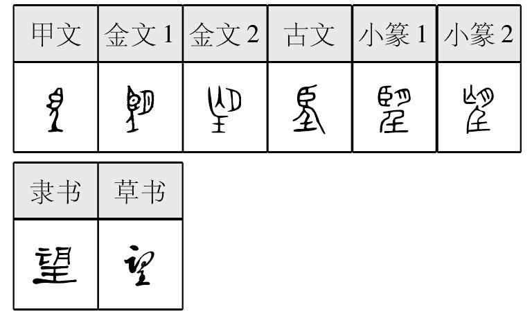 ❹ 不孚众望|不负众望|大失所望|大喜过望|东瞧西望|东张西望|肩背相望|惊喜过望|馁殍相望|徘徊观望|殊失所望|倚闾而望|引颈而望|引首以望|云霓之望 望望(朢),甲骨文作   ,金文作     ,《説文》古文作 ,小篆作 。 象一人立地張目遠眺。金文增从月或因表示月相,或因表示望月。竪 “目” 形近 “臣”,故後世 “望” 字或从臣。竪 “目” 又或訛作 “耳”,又演化作 “亡”,乃成聲符。依次比較金文二、三、四、五字形,由从目到从耳再到从亡的演化軌迹清晰可見。“人”形下或加 “土”,本來表示人站在地上,“人”與 “土”相連則爲 “壬”(tǐng)字,與 “年”字演變相同,這也可以從甲骨文字形的演變情况中看到。“望” 的本義是遠眺,引申爲看望、盼望、企圖、景仰、名望、儀容等義。文獻或通 “忘” “妄” “方”。又用作祭名、月相名。卜辭或用本義,或用作方國名。銘文多用作月相名。或用作人名。又或通 “忘”。 楚簡帛文作 ,沿襲古體。秦簡牘文作 ,古隸典型,或有减省。 望朢;望;望wàng(11画)