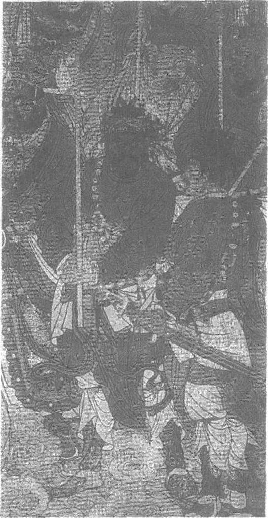 元。纵330厘米,横165厘米。山西省芮城县永乐宫三清殿东壁南部下层壁画。画面绘四位天丁力士,均头缠巾,分着蓝、绿、朱、黄四色布袍,脚蹬薄长靴,腰佩长剑,手持瓜斧,在履行护卫之职责。前排的飞天神将黑脸,身体魁伟,分脚而立,持斧的双手蕴藏着巨大的力量,神态具有很大的威慑作用。后排三元将军中的葛雍,络腮胡须,双眉紧拧,怒目而斜视,獠牙外露,似为出手前的一瞬间。作者通过外观形象的刻画,将人物的内在性格表现得淋漓尽致。